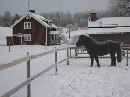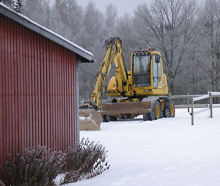 Årets sista dag innebär framför allt förberedelser inför nästa år. Både grävmaskin och belysningsarmaturer är på plats. På måndag inleds arbetet med att göra en ridbana och dränera runt grunden på annexet. Trots den stränga kylan så blir det nog inga större problem med tjälen eftersom snön legat som ett isolerande täcke över hela Aspegården.