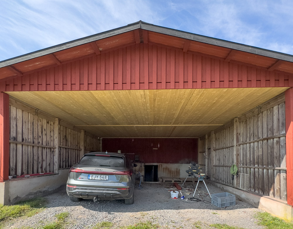 31 juli. Äntligen blev carporten säkrad mot fågelspillning på bilarna. Innertak och gavelspets är på plats. Nu väntar vi bara på att elektriker ska komma och installera ny belysning.