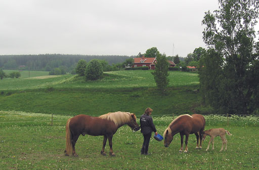 Nu är ligghallen utgödslad, hästarna avmaskade och allt är klart för sommarbete! Minstingen Vilja har börjat miljöträna med promenader i omgivningarna, bett i munnen och tyngd på ryggen. Från grannarnas hagar hörs lammen och vi börjar nervöst titta på vårt dräktiga sto. Vårbruket är utlagt på konsult så vi står mest och tittar på när havre och vallfrö hamnar där det ska.