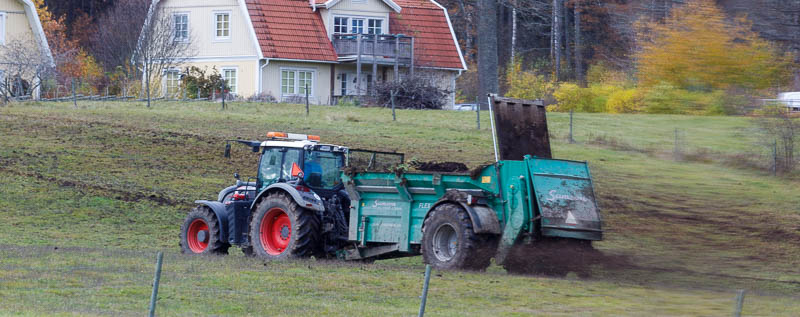 25 oktober. En vecka av storstädning utomhus. Maskinstationen kom med lastare och gödselspridare så vi kunde få vår gödselplatta tömd. Gården har en stooor gödselplatta så det händer ungefär vart femte år att vi behöver få den tömd. Nu har också mängder av löv fallit. Lövblås, räfsa och traktorskopa är bra verktyg för att få fason på gräsmatta och grusgång.